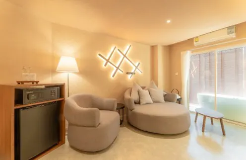 พักใจและผ่อนคลายแบบใกล้ชิดธรรมชาติ ห้องพักที่เห็นวิวดอยสุเทพเต็มตา ช่วยให้คุณรู้สึกอบอุ่นและสงบสบายๆด้วยอ่างอาบน้ำริมระเบียง น้ำอุ่นๆ แช่ตัว ช่วยให้คุณได้ผ่อนคลาย ใกล้ชิดธรรมชาติ พร้อมทั้งโซฟากลมขนาดใหญ่ให้คุณและคู่รักได้รู้จักกันมากขึ้น สิ่งอำนวยความสะดวกที่ครบครัน ช่วยให้เป็นส่วนหนึ่งในทริปที่แสนพิเศษของคุณ